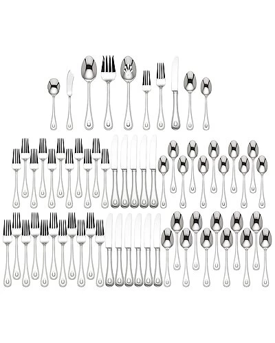 - Crafted of 18/10 stainless steel, this 65-piece flatware set features a gentle teardrop shape at the bottom of the handles, decorated with dainty beading for an elegant look, and is ideal for upscale dining with treasured guests. This set includes at twelve dinner forks, twelve dinner knives, twelve salad forks, twelve tablespoons, twelve teaspoons, one serving spoon, one serving fork, one pierced serving spoon, one sugar spoon, and one butter knife.