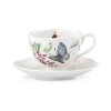 - With a scalloped rim and lively blue butterfly floating through a floral motif, this durable white ceramic porcelain mug makes an ideal fit for the day’s first cup. From the Butterfly Meadow collection, this mug is microwave and dishwasher-safe.