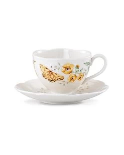 - The durable white ceramic porcelain Fritillary Cup and Saucer boast scalloped edges with a vibrant springtime illustration of flowers and butterflies. From the Butterfly Meadow Collection, the cup and saucer are dishwasher and microwave-safe.