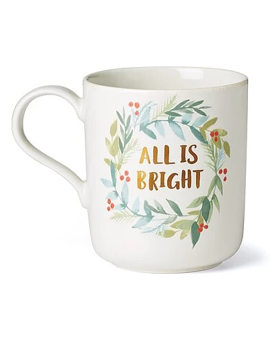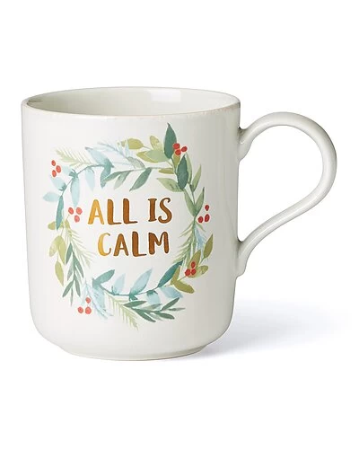 - Design details: a festive fresh spin on the French perle favorites. These mugs feature a wreath of artistic holiday holly with leaves, branches, and berries in a hand painted style around the words “all is calm”. Crafted with smooth scallops on a snowy white base for a creative winter feel.