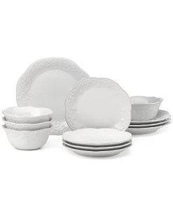 - This 12-piece dinnerware set, crafted of durable white ceramic stoneware, includes a gentle scalloped border along the dinner plates, salad plates, and serving bowls. This set features a delicate textured dot pattern that elevates meals from casual to formal. This item is dishwasher-safe, for added convenience.