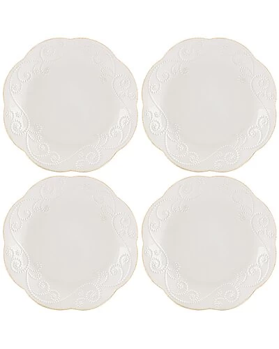 - This rustic set of four dessert plates, crafted of durable white ceramic stoneware, includes a scalloped border with a hand-applied tea stain accent, and a pattern of beads that scroll and swirl about the edge of the plates. This item is microwave and dishwasher-safe, for added convenience.