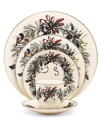 - Design details: the classic winter greetings collection features peaceful birds perched amidst a motif of pinecone, holly and mistletoe. Crafted from durable porcelain with 24k gold accents, this 5-piece place setting makes an artful addition to the holiday tabletop.